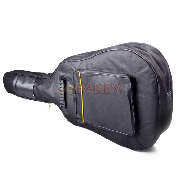 The soft case design combines the protection of a thick padded interior with the portability of a gig bag. The interior is lined with foam material to provide substantial protection for your guitar. This lightweight acoustic/bass guitar gig bag features an exterior accessory pocket; heavy-duty zippers; two carry handles ,and removable backpack straps.