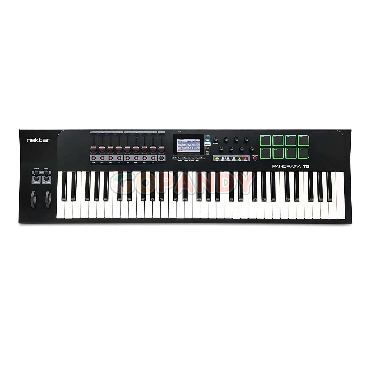 The Nektar Technology Panorama T6 is a 61-key USB MIDI controller designed to deliver versatile, efficient DAW and virtual instrument control for producers, musicians, beatmakers, and songwriters in home, project, and mobile studios. With 61 velocity- and aftertouch-sensitive keys, eight velocity- and pressure-sensitive LED color pads, and multiple velocity curves for the keys and pads, it is well suited to a variety of playing styles. Tactile control of software instruments and DAW programs is executed via nine 30mm faders, eight assignable encoders, eight assignable LED buttons, four navigation buttons, and six LED transport buttons.