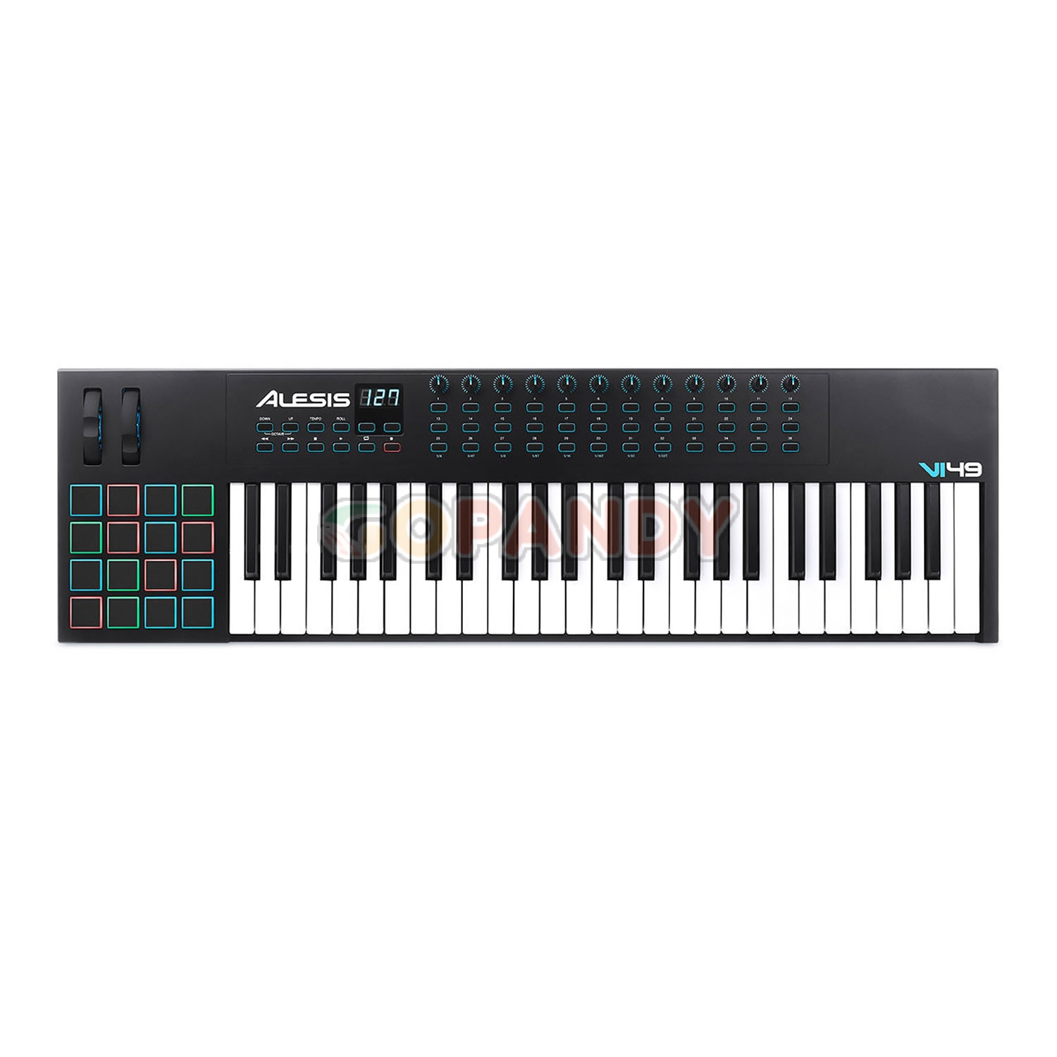Giving you a wide variety of playing and parameter control, the VI49 49-Key USB/MIDI Keyboard Controller from Alesis features semi-weighted keys with aftertouch and 16 velocity-sensitive trigger pads. For parameter and programming options, the controller has 36 assignable buttons and 12 assignable knobs that can control any MIDI-assignable parameter in your DAW or virtual instrument. For added flexibility, the VI49 gives you both USB and 5-pin DIN MIDI out,, allowing you to connect to both software and hardware-based systems. A USB cable, and downloads for Ableton Live Lite and Xpand!2 are included.