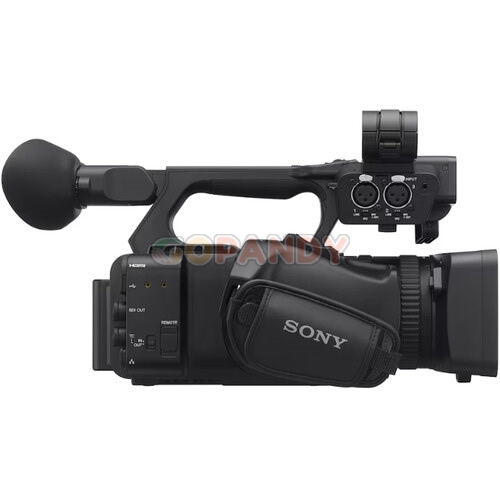This camcorder’s interface includes up to 12G-SDI output, timecode input and output, genlock, USB-A, USB-C, LAN, REMOTE, and additional connectors.